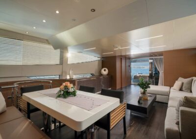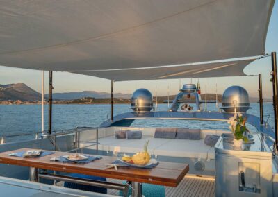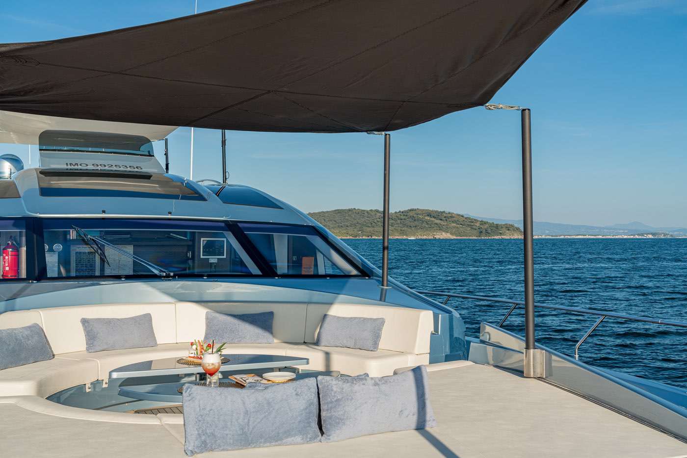 The spacious salon features a large sofa with a light-shade fabric and an internal dining table. The extremely flexible flybridge has an outdoor table and a large sunbathing area. A shading tent is provided throughout the flybridge. At the stern, there is a dining/relax area with a folding television, a barbecue, a fridge and a large sunbathing area. At the bow there is a large sunbathing area with a wide round sofa that can comfortably seat up to 14 people.
